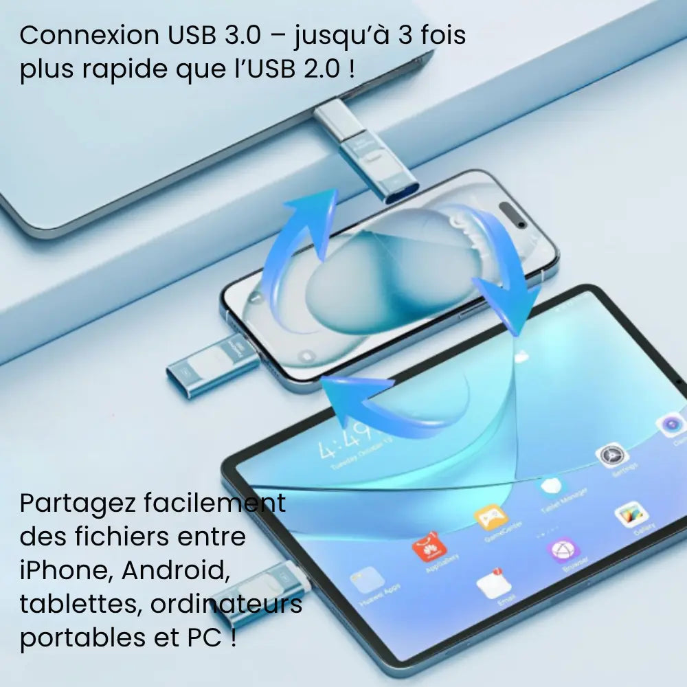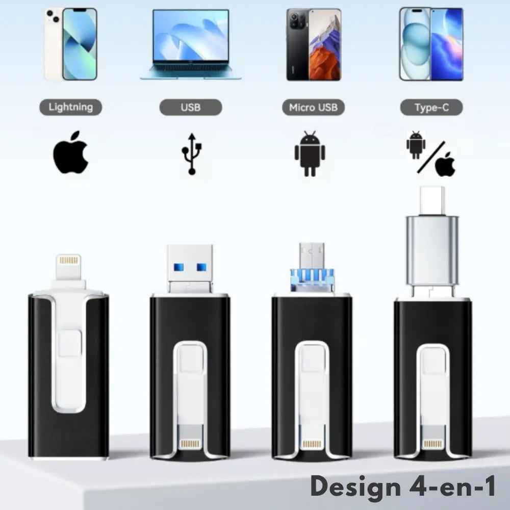 La DataKey™ dispose de 4 connecteurs intégrés : USB, USB-C, micro-USB et Lightning. Elle est compatible avec la majorité des smartphones (iPhone & Android), tablettes, ordinateurs portables et de bureau.